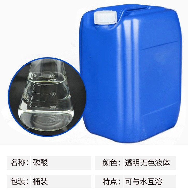 熔點42.35℃,比重1.70,高沸點酸,可與水以任意比互溶,沸點213℃時(失去1/2水),則生成焦磷酸。加熱至300℃時變成偏磷酸。相對密Chemicalbook度181.834。易溶于水,溶于乙醇。磷酸是一種常見的無機酸,是中強酸。其酸性較硫酸、鹽酸和硝酸等強酸弱,但較醋酸、硼酸、碳酸等弱酸強。磷酸與碳酸鈉反應(yīng)時在不同的pH下,可生成不同的酸式鹽。能刺激皮膚引起發(fā)炎,破壞肌體組織。濃磷酸在瓷器中加熱時有侵蝕作用。有吸濕性,密封保存。磷酸主要應(yīng)用領(lǐng)域如下:金屬表面鋼管磷化處理,配制電解拋光液和化學拋光液;鋁制品的拋光;制造各種磷酸鹽、飼料級磷酸氫鈣、酸式磷酸錳、焦磷酸鉀;醫(yī)藥工業(yè)用于制造甘油磷酸鈉、磷酸鐵,制造青霉素時調(diào)節(jié)酸堿度;用于制造磷酸鋅作為牙科補牙時粘合劑;塑料用于酚醛樹脂縮合的催化劑Chemicalbook;染料及中間體生產(chǎn)用的干燥劑;印刷用于配制揩去膠印彩印版上污點的清洗劑;火柴用于浸漬火柴梗,能使燃燒過的火柴梗不成灰而成炭狀,使用時較為安全;冶金用于生產(chǎn)耐火泥,提高煉鋼爐壽命;橡膠用于漿料的凝固劑及生產(chǎn)無機粘結(jié)劑的原料;涂料用于金屬防銹漆;食品工業(yè)用作酸性調(diào)味劑。